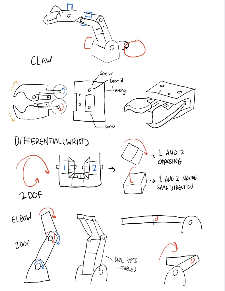 The forearm initially was one solid piece, but i realized i made had to add a lot of modifications and addition, through making the servo fit tolerances tighter to prevent it being too loose, and making the arm shorter to minimize moment on the joints.