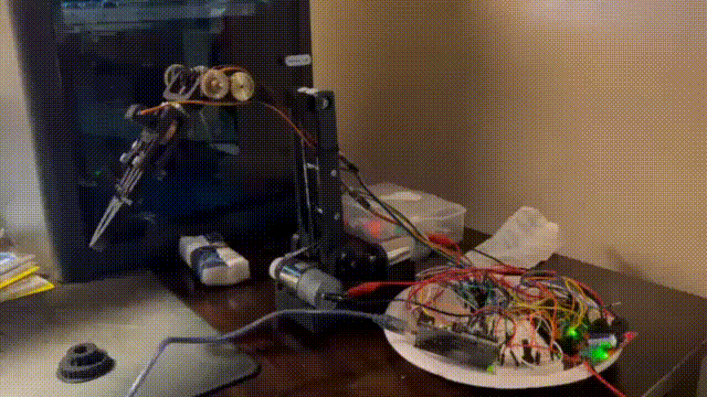 After arm assembly, I created an iteration that used buttons as the inputs, utilizing the light input circuit but for moving the arm as well. I had to be careful about current draw, as moving too many servos at once and experiencing too much torque would cause stall.